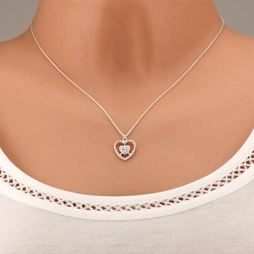 925 ezüst nyakék, amely ferdén összekapcsolt elipszis alakú szemekből álló láncból áll. A láncon egy medál függ szív körvonal alakban, amely közepébe egy kisebb telt szív van helyezve. A telt szív a körvonallal három fényes pálcikával van összekapcsolva. Mindkét szív szimetrikus és átlátszó cirkóniákkal van kirakva. A medál hátsó része a kövek alatt kerek kiv