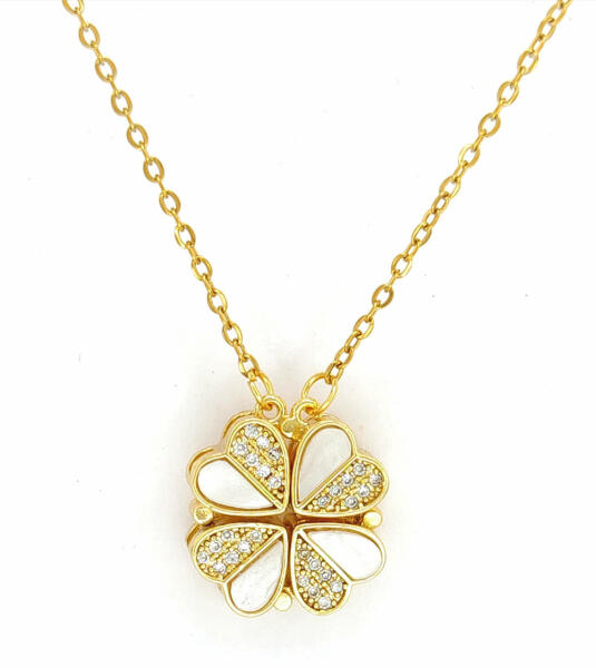 Aranyszínű nemesacél ( 316L ) nyaklánc, nemesacél ( 316L ) különleges medállal, melyet csillogó fehér cirkónia kristályok és fehér kagylóbetét díszít. A kristályok karmos foglalatban helyezkednek el. A medál egyik formája stilizált négylevelű lóhere, másik formájában négy összefűzött szivet mintáz. A medált mágnes tartja össze, hogy a lóhere minta fix maradjon,