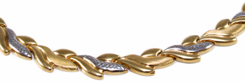Modern stílusú, méreténél fogva igen mutatós, ez a ródiummal, mattítással és csillogó véséssel díszített stiftes arany nyakék.