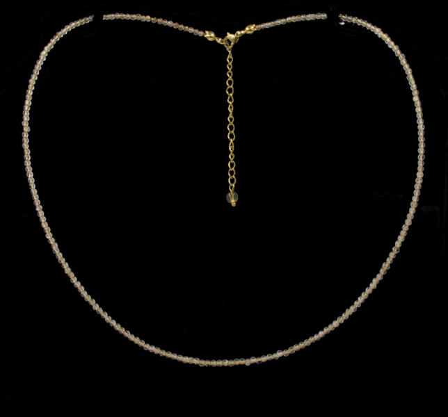 Citrin ásványból készült, indiai, kézzel csiszolt apró gyöngyös nyaklánc. A nyaklánc acél szálon, szép, íves esésű, aranyozott orvosi acél szerelékkel, 5 cm-es lnc hosszabbítóval, a megfelelő méret beállításához. Ásványgyöngyök mérete: 2,5mm Az Citrin gyógyhatása