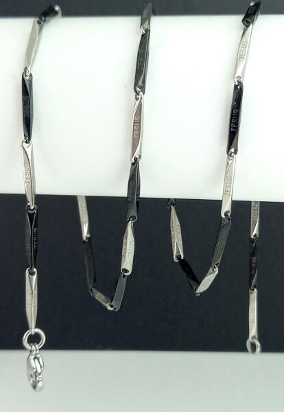 Nemesacél (316L) fekete-ezüstszínű nyaklánc. Az ezüstszínű szemeket Jesus felirat díszíti. Minőségi anyagának köszönhetően nem kopik, nagyon nehezen karcolódik, nem színeződik. Antiallergén ékszer. Hossza: 55 cm. Szélesség: 2 mm. Igény esetén rövidíthető, melyet ajándékba elvégzünk. A kért méretet kérjük a megjegyzés rovatban felüntetni. A nemesacél ékszerek