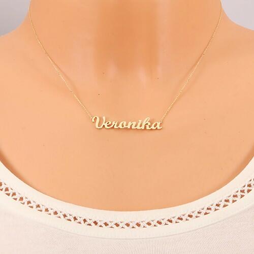 A sárga 14K arany nyakláncot ferdén összekapcsolt, ovális szemekből álló, csillogó, vékony lánc alkotja, amelyen egy medál található. A medál a "Veronika" nevet formálja, míg az "i" betűn lévő pontot egy szívecske helyettesíti. A nyakláncnak állítható hossza és delfinkapcsos zárszerkezete van. Medál méretei: 42 x 9 mmLánc szélessége: 0,8 mmNyaklánc hossza: 440 mmH