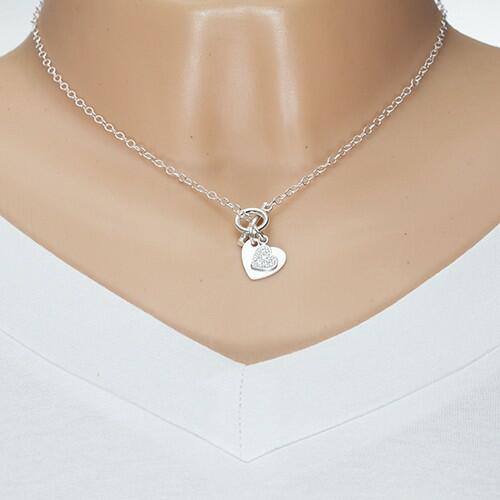 A 925 ezüst nyakék ferdén összekapcsolt ovális szemekből álló láncból és medálból tevődik össze. A medál két külön függő lapos szív alakú - a nagyobbik fényes és sima, a kisebbiket beültetett átlátszó cirkóniák díszítik. A nyakék amerikai kapoccsal záródik, karika és pálca segítségével, amelyek az elülső részen vannak elhelyezve. A nagyobb szív méretei