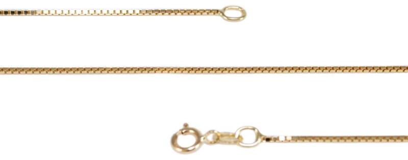 Kedvelt fazonú, fényes, szögletes profilú "velencei kocka" vékony aranylánc.