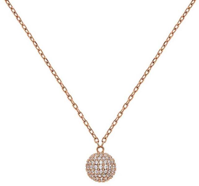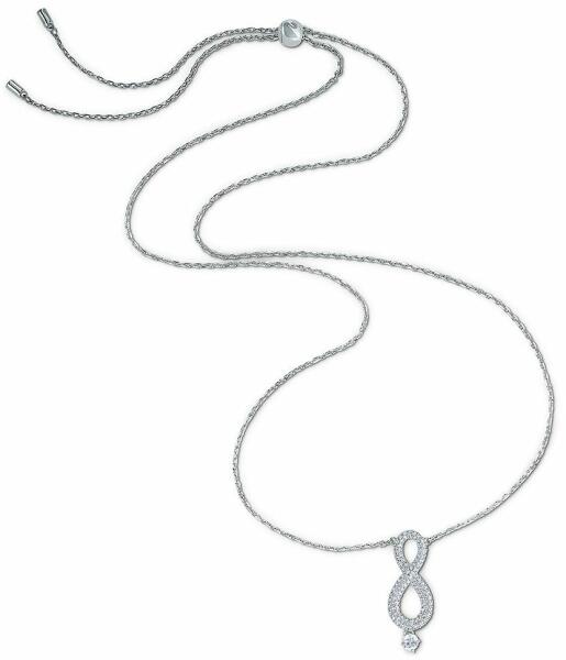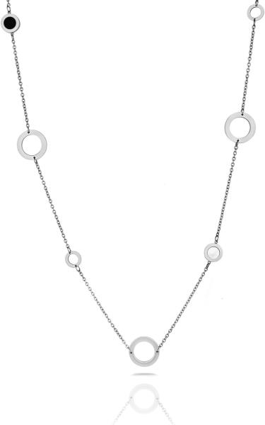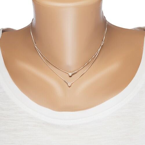 A 925 ezüst nyaklánc apró, szögletes szemekből álló láncból áll, amely középtályon ketté válik. A rövidebb és hosszabb láncra is kerek átlátszó cirkónia van odafogatva. Mindkét cirkónia egyik oldalát keskeny, üreges henger forma egészíti ki. A nyaklánc delfinkapoccsal záródik. Cirkónia átmérője: 4 mmTeljes díszes rész méretei: 12 x 4 mmLánc szélessége: 0,9