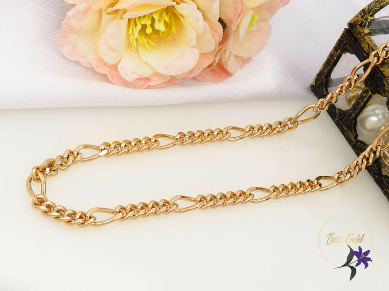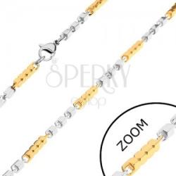 A sebészeti acél lánc fényes felületű és hasáb alakú elemekből tevődik össze. A lánc mintáját felváltva elhelyezett, egy arany színű hasáb és három rövidebb, ezüst árnyalatú elem alkotja. A hosszabb elemek minden oldalán három apró bemetszés található. A láncnak delfinkapcsos zárszerkezete van. Lánc szélessége: 3 mmLánc hossza: 570 mmZárószem átmérője: 5 m