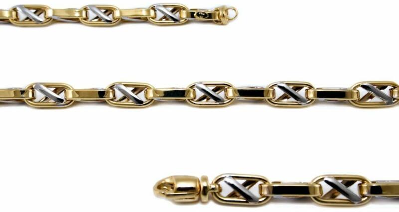 Modern stílusú, méreténél fogva igen mutatós, masszív kialakítású, ródiummal díszített szögletes profilú "barakka jellegű" aranylánc.