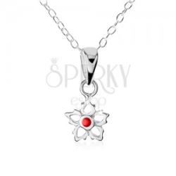 925 ezüst nyakék, ferdén összekapcsolt, ovális szemekből álló láncból és virág körvonalú medálból. A virág kivágott és csúcsos szirmai vannak, a közepe pedig, kicsi, fénymázas golyóval van díszítve piros színben. A nyaklánc delfinkapoccsal záródik és a hossza állítható. A medál méretei: 7 x 7 mmA medál súlya: 0,3 gA lánc szélessége: 1 mmA lánc hossza: 450