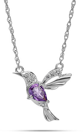 A kolibri az öröm, a szabadság és az energia szimbóluma, ami ennek a gyönyörű ékszernek az aprólékos ékszermunkájában is tükröződik. A nyakláncot összesen 0,0600 ct súlyú, H színű és SI1 tisztaságú gyémántok díszítik, amelyek kiváló szimmetriája és kidolgozása biztosítja a káprázatos ragyogást. A kolibrit egy 0,30 ct súlyú természetes ametiszt díszíti, a