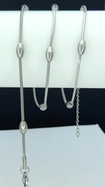 Ezüstszínű nemesacél ( 316L ) hengeress kígyólánc, melyet hosszított gömbök díszítenek. Időtálló ékszer, amit fürdéskor sem kell levenni, bátran viselhető folyamatosan. Antiallergén ékszer. Hossza: 42 cm + 7 cm hosszabbító. Nyaklánc szélessége: 1 mm. Gömbök szélessége: 4 mm. A nemesacél ékszerek rendkívül népszerűek kedvező tulajdonságaik miatt. A nemesacél