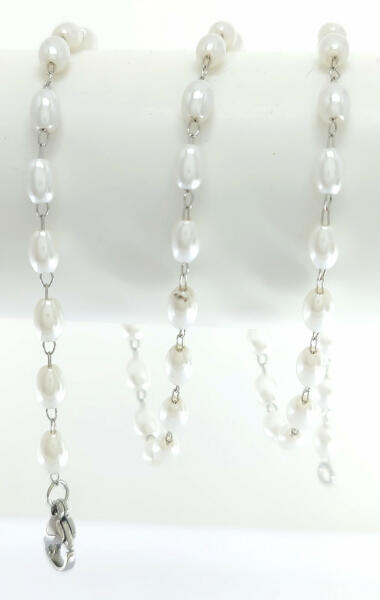 Ezüstszínű nemesacél (316L) nyaklánc, melyet fehér acryl ovális gyöngyök díszítenek. Időtálló ékszer, amit fürdéskor sem kell levenni, bátran viselhető folyamatosan. Nagyon könnyű, kényelmes viselet. Antiallergén ékszer. Nyaklánc hossza: 50 cm. Nyaklánc szélessége: 4 mm. A nemesacél ékszerek rendkívül népszerűek kedvező tulajdonságaik miatt. A nemesacél semmily