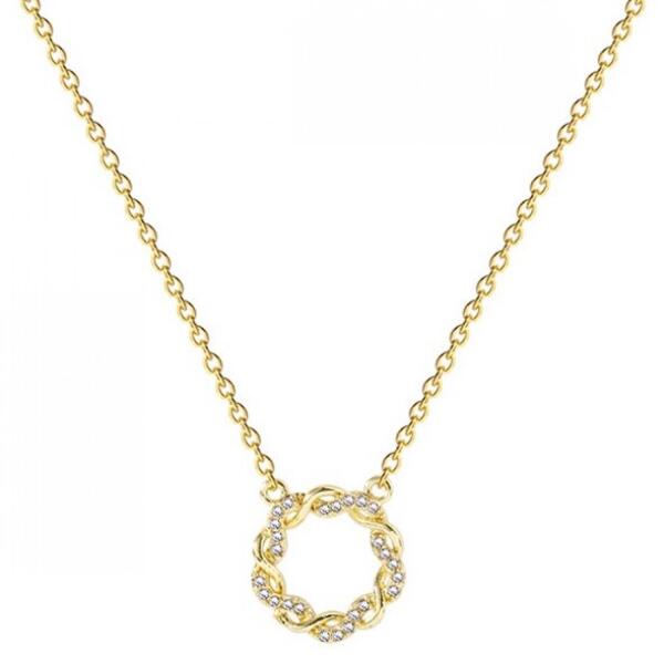 A sárga 14K arany nyakláncot ferdén összekapcsolt, ovális szemekből álló, fényes lánc alkotja. A medált egy lekerekített foglalat képezi, beültetett, kerek, világoslila cirkóniával. A világoslila cirkónia a "Június" születési hónapot szimbolizálja. A nyaklánc állítható hosszal és delfinkapcsos zárszerkezettel rendelkezik. Medál átmérője: 5 mmLánc szélessége: 1,