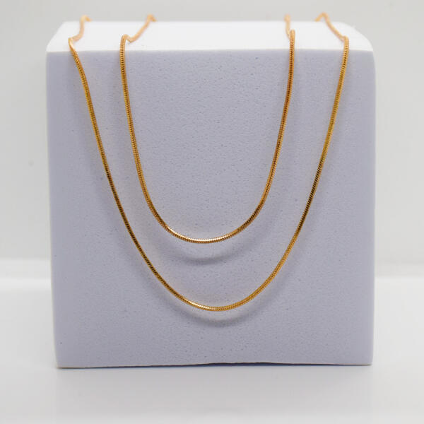 Klasszikus és kedvelt fazonú, 3+1 szemkötésű, üreges, de masszív szemekből készült aranylánc.
