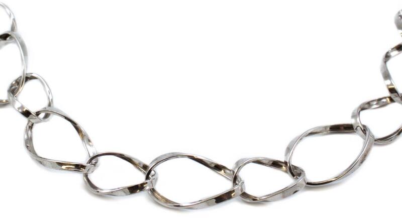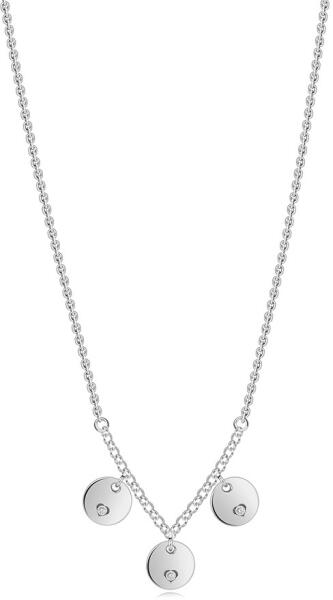 Platinával bevont 925 ezüst nyaklánc vékony ovális láncszemekből álló lánccal, amelyek függőlegesen kapcsolódnak egymáshoz. A nyaklánc közepén egy kerek láncszemekből álló lánc található, három kis lapos korong alakú medállal. Mindegyik korong közepén egy-egy szív kivágás található, amelybe egy átlátszó kerek gyémánt van foglalva. A nyaklánc rugós gyűrűz