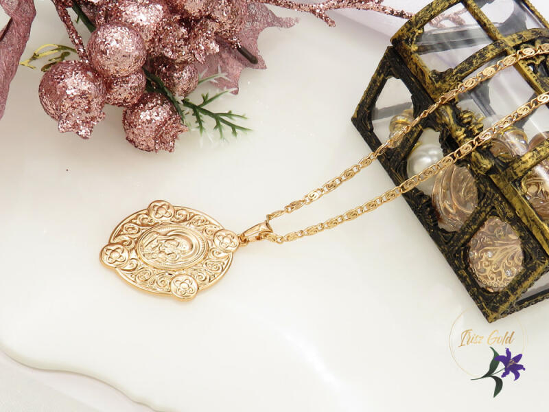 Antiallergén Vallási témájú medál gyönyörű szemekből álló nyaklánccal Szin: 18k aranyszínű Méret: 50cm/3mm Medál:45x30mm A forgalmazott divatékszerek alapanyaga nikkel és ólommentes ezért többnyire nem okoznak allergiás tüneteket , nyugodtan hordhatják fémérzékeny emberek is. Általában nem színezik a bőrt és más divatékszerekhez képest nagyságrendekkel jobb kop