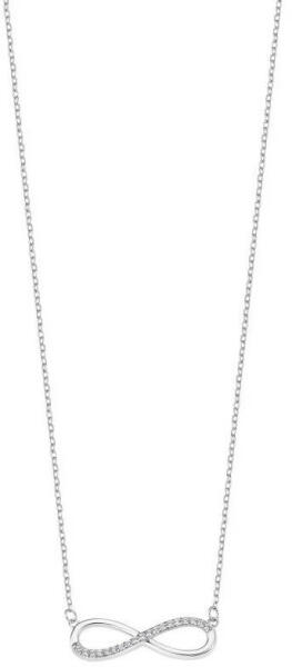 925 ezüst nyakék sűrűn összekapcsolt apró szemekből álló láncból, melyen karika alakú medál függ. A kör egyik fele fényes és sima, a másik átlátszó cirkóniákkal van kirakva. A nyakék delfinkapoccsal záródik. A medál átmérője: 15 mm A nyakék súlya: 2,4 g A lánc szélessége: 1 mm A lánc hossza: 450 mm (+/- 5%) Fémjelzéssel ellátott.