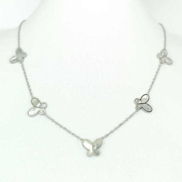 Ezüstszínű nemesacél ( 316L ) nyaklánc, melyet öt, kagyló díszítéses pillangó medál tesz különlegessé. Időtálló ékszer, nem kopik, nem feketedik víz hatására. Antiallergén ékszer. Nyaklánc hossza: 40 cm + 5 cm hosszabbító. Nyaklánc szélessége: 1,5 mm. Medálok mérete: 5 mm x 6 mm. A nemesacél ékszerek rendkívül népszerűek kedvező tulajdonságaik miatt. A nemes