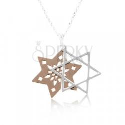 A 925 ezüst nyakláncot ovális szemekből álló fényes lánc és medál alkotja, amely két csillag alakja kivágásokkal. A medál alsó része réz színű és apró kivágok díszítik. A felső rész Dávid csillag körvonala ezüst színben. A nyaklánc delfinkapoccsal záródik. Medál méretei: 19 x 23 mmMedál súlya: 1,3 gLánc szélessége: 1,3 mmNyaklánc hossza: 410 mm (+/- 5%)Nyak