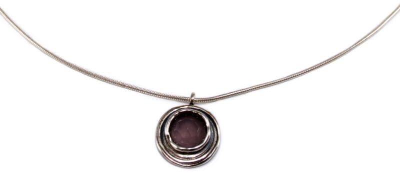 Igen kedvelt fazonú, ezüst láncon antikolással díszített, ródiummal bevont, középen rózsakvarc kővel ékített medál.