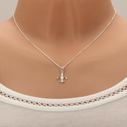 Állítható nyakék 925 ezüstből királyi liliom medállal, mely közepében függőleges átlátszó kerek cirkóniás vonal húzódik. A nyakék delfinkapoccsal záródik. A medál méretei: 12 x 13 mm A medál súlya: 0,5 g A lánc szélessége: 1 mmA lánc hossza: 400 mmPlusz hossz: 50 mm Teljes hossz kihúzással: 450 mm (+/- 5 %) A lánc súlya: 1,3 gFémjelzéssel ellátott.