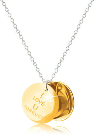 A 925 ezüst nyaklánc egy fényes kerek, arany színű medalionból áll. A tetejére az "I LOVE U FOREVER" - "Örökké szeretni foglak téged" felirat van gravírozva. A medalion belsejében egy lemniszkáta - a végtelenség szimbóluma - található, amelynek egyik vonalát átlátszó cirkóniák díszítik, míg a másik vonal sima és fényes. A láncot ovális láncszemek alkotják, amely