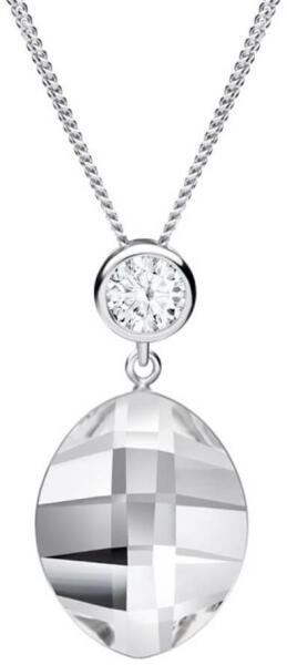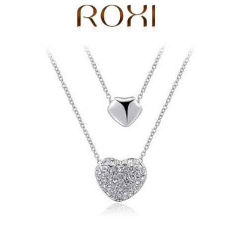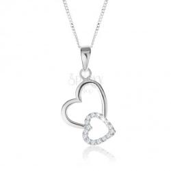 Állítható nyakék 925 ezüstből enyhe láncból két szimmetrikus szívkörvonalú medállal. A nagyobb szív sima és fényes felszínű. A kisebb szív az alsó részében helyezkedk el és gazdagon díszített átlátszó csillogó cirkóniák díszítik. A nyakék hossza állítható és delfinkapoccsal záródik. A medál méretei: 14 x 19 mmA medál súlya: 1,0 g A lánc szélessége: 1