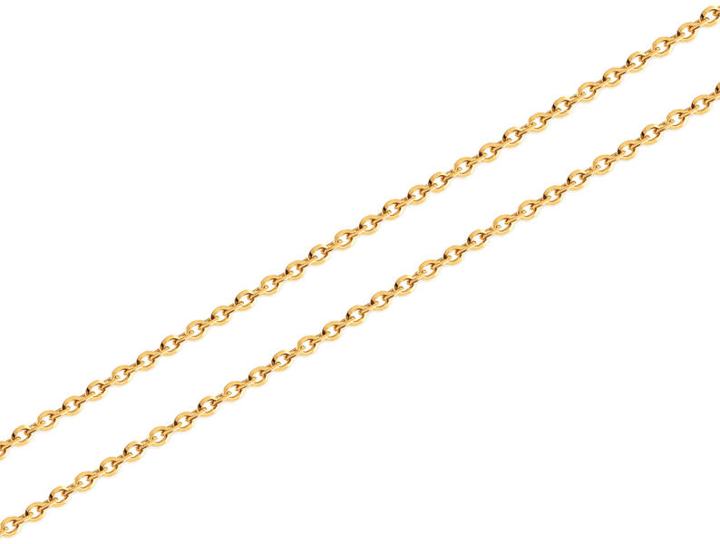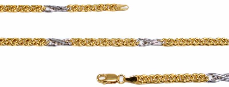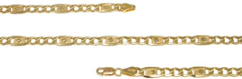 Klasszikus és kedvelt fazonú, üreges kialakítású, mattított mintás betéttel díszített, 3+1 szemkötésű aranylánc.