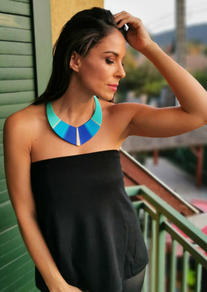 Hímzőfonalból és újrahasznosított műanyagból készült nyakék türkiz és kék színekben.