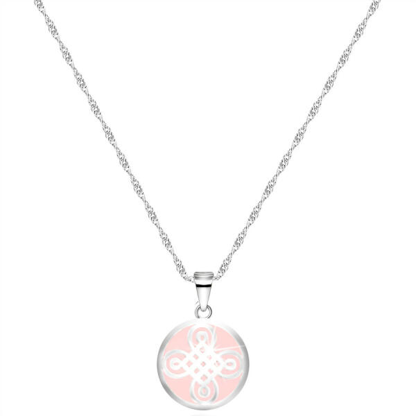 A 925 ezüst nyaklánc egy vékony fényes láncból áll, amelyet kettős kerek láncszemek alkotnak. Az egymásra merőlegesen összekapcsolt szemek spirális formába csavarodnak. A medál karika alakú, amelybe egy kelta csomó van rózsaszín háttérre helyezve. A medált le lehet venni a láncról. A nyaklánc hosszúsága állítható. Rugós karika kapocs. Láncszélesség: 1,1 mmA lánc