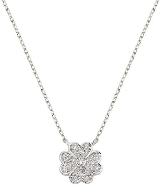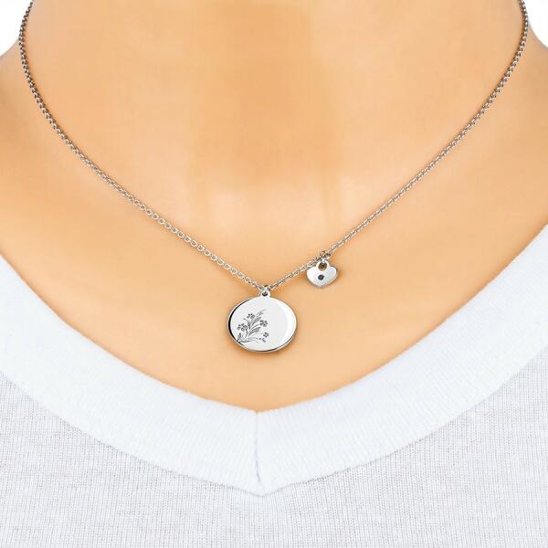 A 925 ezüstből készült, platina bevonatú nyaklánc apró ovális láncszemekből álló lánccal, amelyek függőlegesen kapcsolódnak egymáshoz. A láncon egy kisebb, sima szív alakú medál található, melybe egy fekete, kerek gyémánt van. A nagyobb medál lapos korong alakú, amelyre réti virágok vannak gravírozva. A rögzítés rugós gyűrűzárral történik. A szív méretei:7