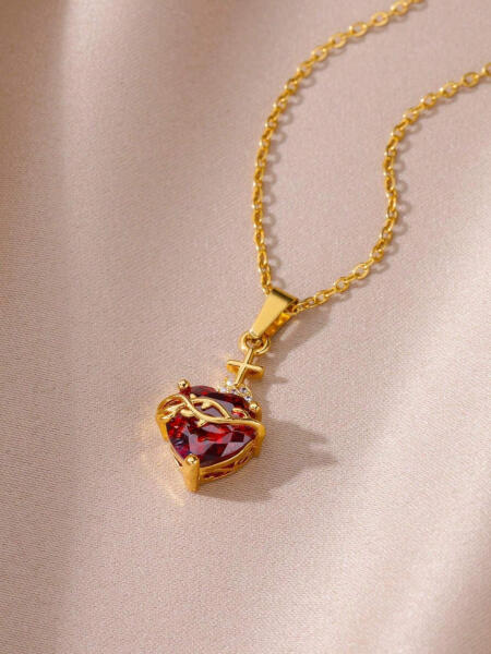 Ez a gyönyörű nyaklánc Jézus Szent Szívének szimbólumát idézi meg egy mélyvörös, szív alakú cirkónia kristály formájában. A medált finom arany indák ölelik körbe, amelyek az Isteni szeretetet és a hitet jelképezik. A felső részén egy apró kereszt található, amely még inkább kiemeli a nyaklánc vallási jelentőségét. Az aranyozott rozsdamentes acél lánc tartós
