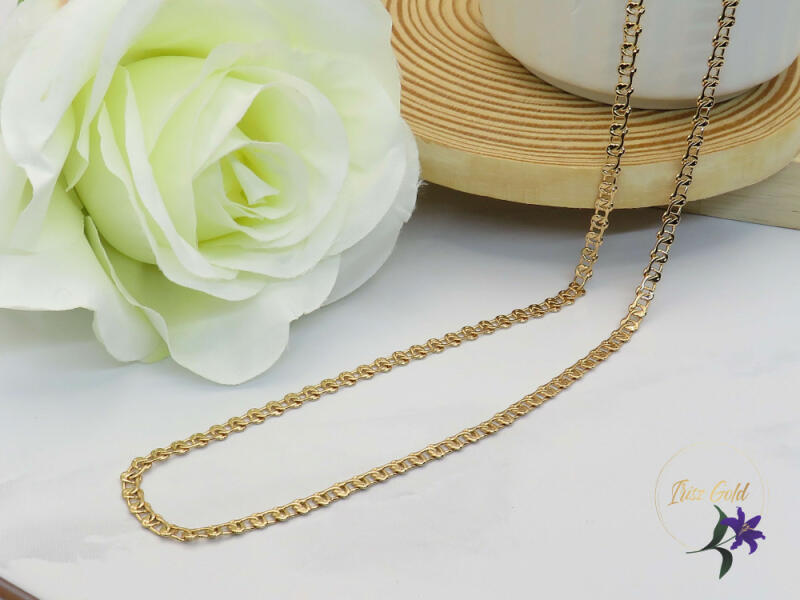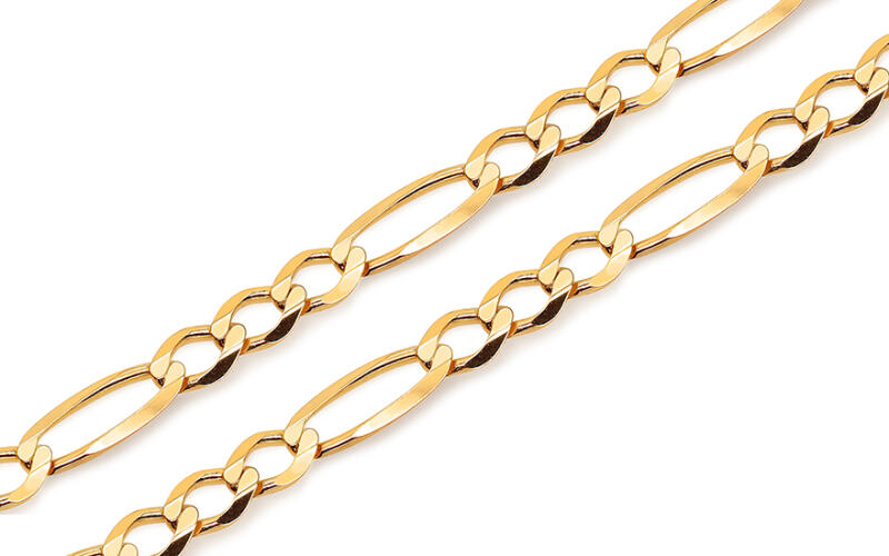 Az elegáns férfi Figaro lánc sárga aranyból készült. A lánc ovális fűzőlyukakból áll, amelyek rendszeres időközönként váltakoznak a kerek fűzőlyukakkal. A lánc felületi felülete fényes.