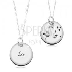 A 925 ezüst nyakék sűrűn összekapcsolt ellipszis alakú szemekből álló láncból és medálból tevődik össze. A medál fényes, lapos, kerek tábla, amelynek egyik oldalát gravírozott "Leo" felirat díszíti fekete színben, másik oldalán az OROSZLÁN csillagjegy, pontok és csillagok találhatóak. A táblát egy kis medál egészíti ki, a csillagjegy szimbóluma. A nyakék hossza