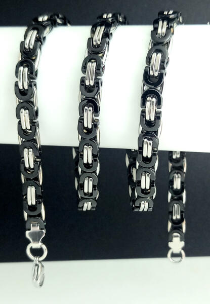 Fekete-ezüstszínű nemesacél (316L) lapos szemes királylánc. Minőségi anyagának köszönhetően nem kopik, nem feketedik. Időtálló ékszer, amit fürdéskor sem kell levenni, bátran viselhető folyamatosan. Antiallergén ékszer. Hossza: 55 cm. Szélesség: 6,5 mm. Igény esetén rövidíthető, melyet ajándékként elvégzünk, a kért méretet kérjük a megjegyzés rovatban feltün
