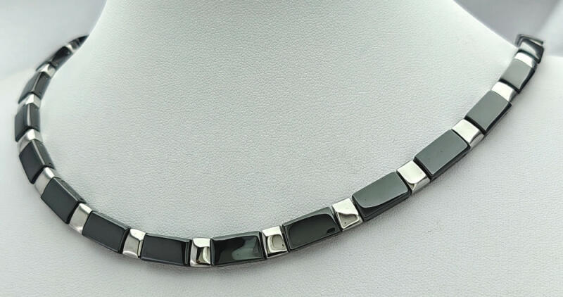 Fekete kerámia nyakék ezüstszínű nemesacél ( 316L ) köztes díszítő szemekkel. A nemesacél előnyös tulajdonságainak ( nem kopik, nem feketedik, nem okoz allergiát ) és a kerámia szépségének ötvözése ez a mutatós nyakék. A kerámia teljes anyagában színezett, tartós, nem törik. A nyakék hátuljában mágnesek találhatóak (élettani hatása közismert). Prémium minős