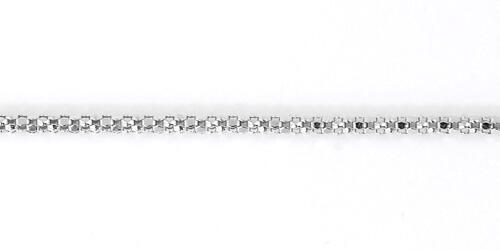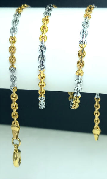 Kedvelt fazonú, 3+1 szemkötésű, üreges, de masszív kialakítású, ródiummal bevont "Figaró" típusú aranylánc.