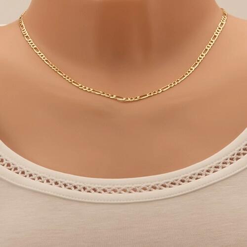 Az arany nyaklánc három ovális és egy hosszúkás szemből tevődik össze, miközben a felülete tükörfényes, sima és lekerekített. Kerek kapoccsal rendelkezik . A nyaklánc szélessége: 3,7 mmA nyaklánc hossza: 450 mm (+/- 5 %)A zárószem szélessége: 2,4 mmA nyaklánc súlya: 3,53 gFémjelzéssel ellátott.
