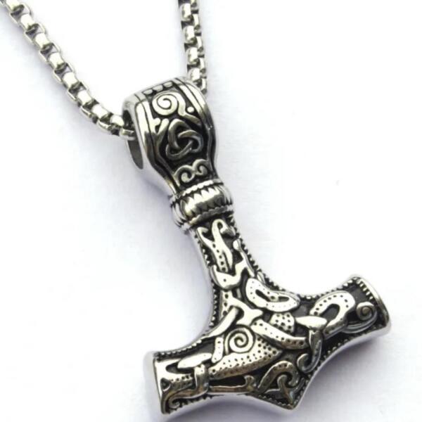 Hammer Nyakék A kalapács formájú medállal ellátott nyaklánc a hatalom, bátorság és a skandináv mitológia megtestesítője. A kalapács részletes kidolgozása, amelyet szimbólumok díszítenek, autentikus viking megjelenést kölcsönöz ennek az ékszernek. Magas minőségű rozsdamentes acélból készült, ellenáll a kopásnak, ami garantálja a hosszú élettartamát. Ideális aj