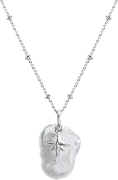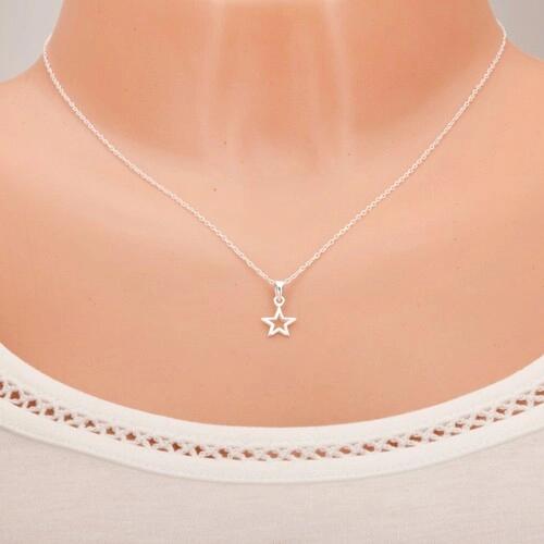 925 ezüst nyakék, amely ferdén összekapcsolt, ovális szemekből álló láncból áll. A láncon egy lapos és fényes csillag körvonal függ. A felső csúcsra egy láncszem van erősítve. A nyaklánc hossza állítható. Kerek kapoccsal rendelkezik . A medál méretei: 9 x 9 mm A medál súlya: 0,35 g A lánc szélessége: 1 mm A lánc hossza: 450 mm (+/- 5%) A lánc súlya: 0,86 g Fémje