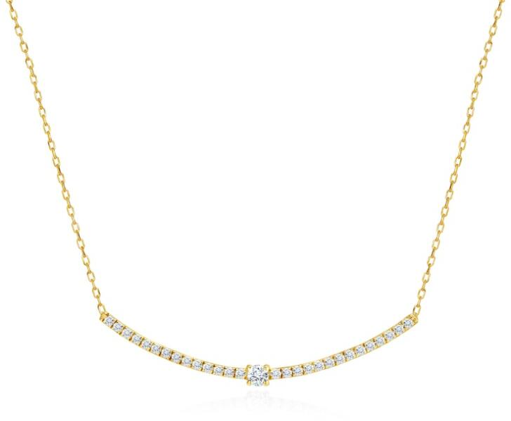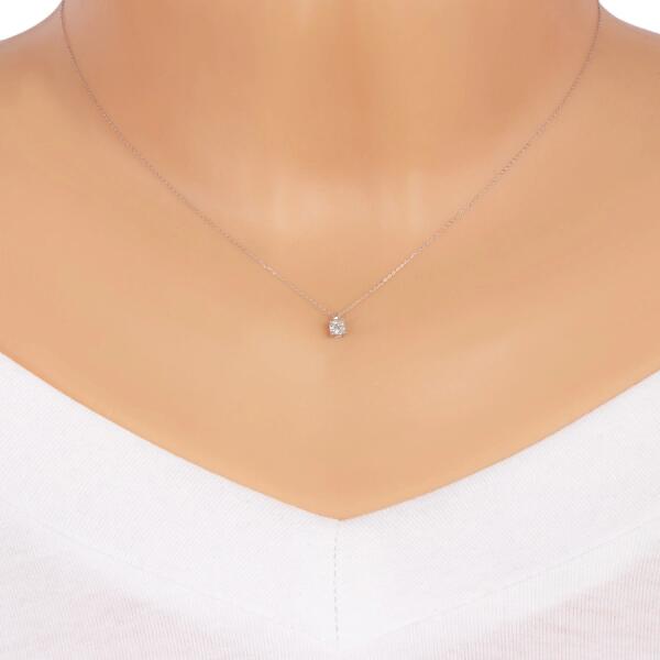 A 9K fehér aranyból készült gyémánt nyaklánc egy finom láncból és egy kerek medálból áll, amelyet négyzet alakú foglalatban lévő apró, csiszolt, átlátszó színű gyémántok díszítenek. Négy sima és fényes foggal rögzítve. A láncot hosszúkás és merőleges láncszemek alkotják. A nyaklánc állítható hosszúságú és rugós gyűrűs zárral rendelkezik. A medál