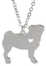 Ezüstös hatású mopsz medál, amelynek a közepén ki van vágva egy szív. Mopsz rajongóknak kötelező darab! A medál 2,5x2,2 cm, a lánc pedig kb. 45cm. De kérheted nem fém lánccal is (pl.