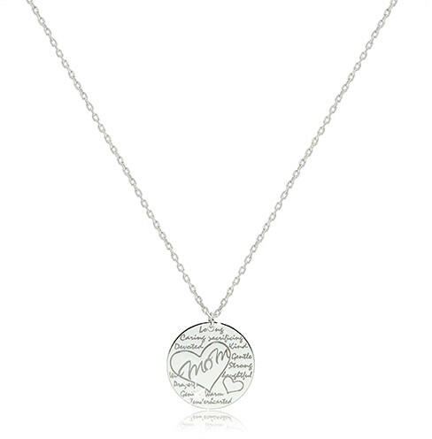 A ródiummal kezelt felületű 925 ezüst nyaklánc egy fényes körből áll, amelyet gravírozott díszes feliratok, egy apró szív és egy szimmetrikus szív körvonalába helyezett "MoM" - "Anyu" felirat díszít. A láncot egymásra merőlegesen összekapcsolt, ovális láncszemek alkotják. A nyaklánc hossza állítható és rugós karika zárszerkezettel rendelkezik. A kör átmérője: 2