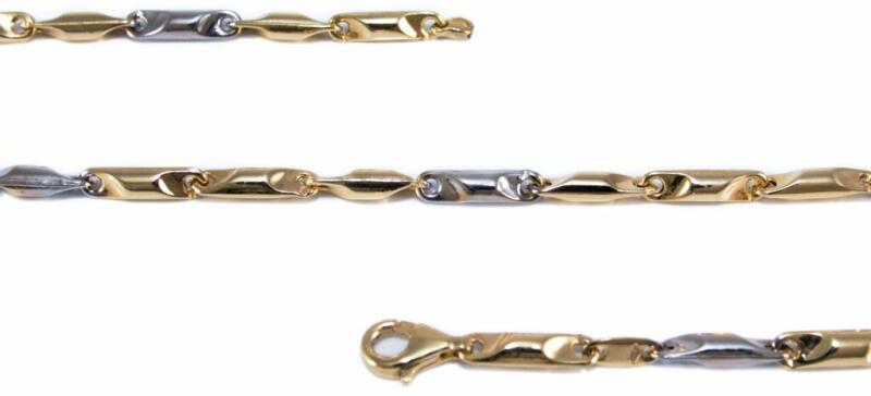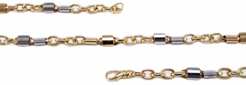 Modern stílusú, igen kedvelt fazonú, ródiummal díszített, üreges szemekből készült, masszív, barakka jellegű aranylánc.