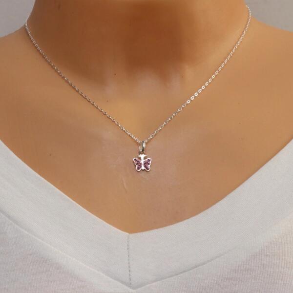 A 925 ezüst nyaklánc egy láncból áll, függőlegesen összekapcsolt ovális láncszemekkel. A lánchoz vékony láncszem erősíti a pillangó alakú, kerek rózsaszín cirkóniákkal és mázzal díszített medált. A nyaklánc rugós gyűrűzárral rögzíthető. Lánc szélessége: 1 mmLánc súlya: 1,64 gMedál mérete: 8 x 11 mmMedál súlya: 0,46 gA nyaklánc hossza: 400 mmHosszabbító