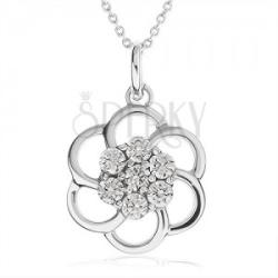 925 ezüst nyakék finom láncból ovális szemekkel és egy medálból. A medált egy fényes virág sziluett alkotja, amely közepében hét átlátszó csillogó kő helyezkedik el kisebb virág alakra rendezve. A nyakék delfinkapoccsal záródik. A medál átmérője: 16 mmA medál súlya 1,8 gA lánc szélessége: 1 mmA lánc hossza: 450 mmA lánc súlya: 1,4 gFémjelzéssel ellátott.