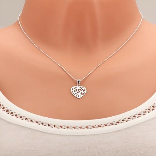Állítható nyakék 925 ezüstből, kicsi, csiszolt golyókból álló csillogó láncból. A láncon egy medál függ, szimetrikus, lapos szív alakban, amely különböző alakú kivágásokkal díszített. A nyakék kerekkapcsos zárszerkezettel rendelkezik . A medál méretei: 15 x 14 mm A medál súlya: 0,87 g A lánc szélessége: 1 mm A lánc hossza: 450 mm (+/- 5%) A lánc súlya: 2,08 g