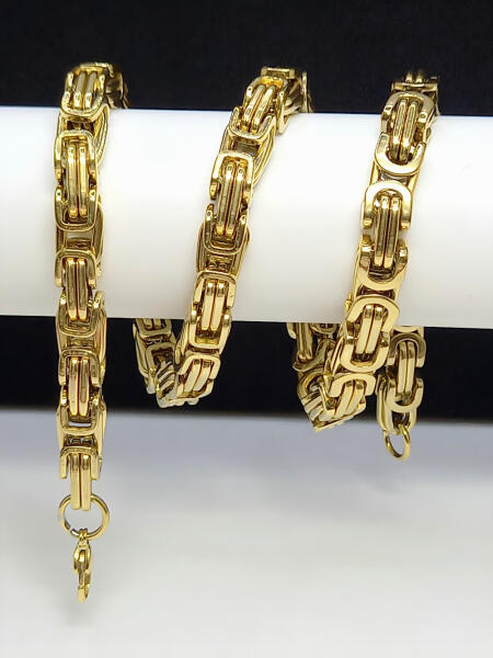 Aranyszínű nemesacél (316L) királylánc. Minőségi anyagának köszönhetően nem feketedik. Időtálló ékszer, amit fürdéskor sem kell levenni, bátran viselhető folyamatosan (eloxált termék). Antiallergén ékszer. Szélesség: 9 mm. Igény esetén rövidíthető, melyet ajándékként elvégzünk. A kért méretet kérjük a megjegyzés rovatban feltüntetni. A nemesacél ékszerek