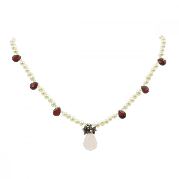 Édesvízi tenyésztett gyöngy nyaklánc gránát, morganit és rózsakvarc drágakövekkel díszítve. A tenyésztett gyöngyök mérete: 5-6mm A nyaklánc hossza 45cm. Kapocs: nemesacél delfinzár