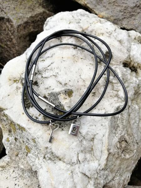 Lakat-kulcs medállal díszített kaucsuk nyakláncpár, mely kifejezi az egymás iránt érzett kötelek és az összetartozást.
