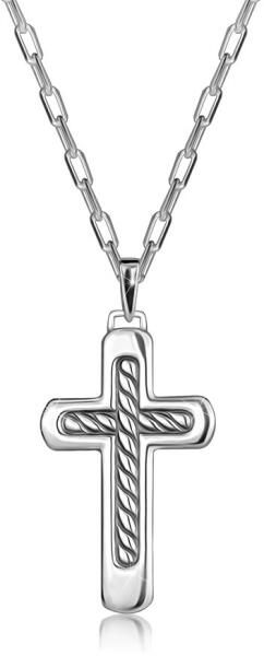 925 ezüst nyaklánc, amely egy hosszúkás, fazettált, hosszúkás láncszemekből készült lánccal. A medál latin kereszt alakú, lekerekített élekkel és középen egy fonatos mintával. A fonat enyhén fémes hatású. A medálon egy ovális láncra kerülő láncszem van, ami felfelé kiszélesedik. A rögzítés egy homárkaromzárral történik. A medál méretei:22 x 39 mmLánc szél